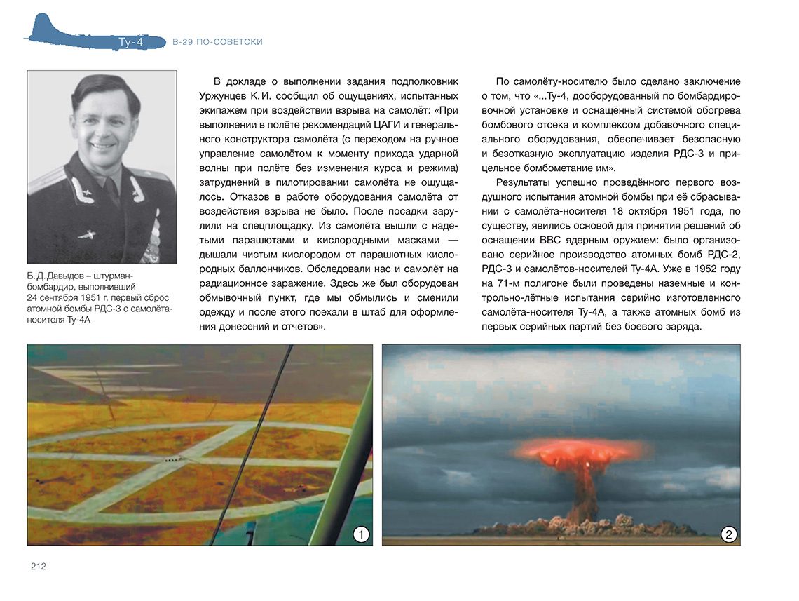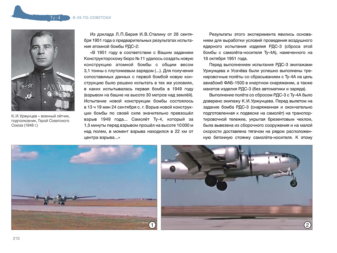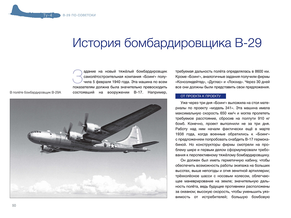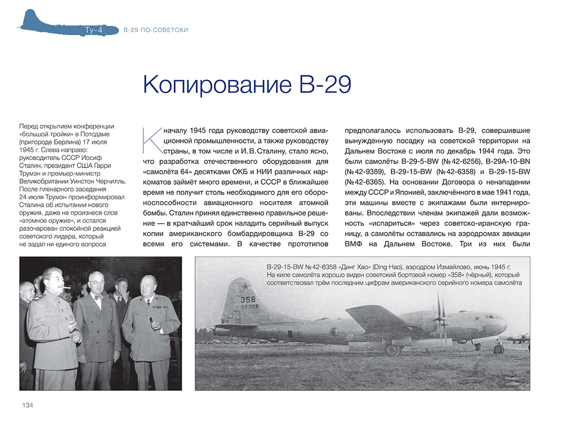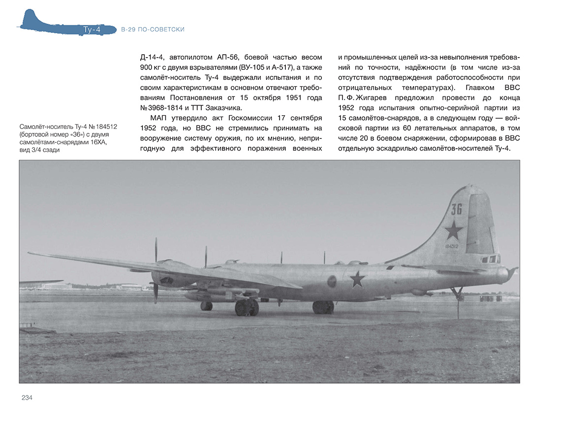 В 1945 году руководство СССР, обеспокоенное состоянием дел по созданию авиационного носителя ядерного оружия, приняло решение развернуть серийное производство Б-4 (будущего Ту-4) — копии американского тяжё-лого бомбардировщика В-29 на основе четырёх интернированных на Дальнем Востоке машин. ОКБ А. Н. Туполева сосредоточило все силы на этой первоочередной работе. Копирование В-29 неизбежно вело к некоторому отставанию от новейших образцов западной техники. Но несмотря на это, почти 1300 серийных машин, в числе которых были самолёты — носители первых советских атомных бомб, стали огромной силой, способной сдерживать амбиции потенциального противника. К тому же освоение производства Ту-4, в котором были применены многие устройства, материалы и технологии, отсутствовавшие в СССР, позволило в конечном итоге создать первое поколение реактивных дальних бомбардировщиков. Введение «Ту-4. В-29 по-советски» ISBN 978-5-60521-661-2 Книга подготовлена издательством ИИГ «Полигон-пресс»Содержание